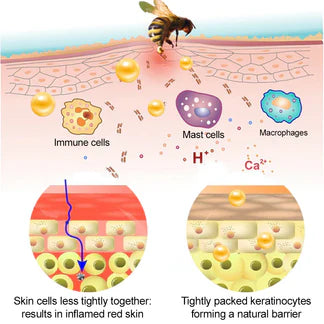 O veneno de abelha contém proteínas, peptídeos e enzimas, sendo a melitina o principal ingrediente ativo (50% do peso seco). Este peptídeo oferece poderosas propriedades anti-inflamatórias, reduzindo as citocinas pró-inflamatórias que desencadeiam a inflamação, ajudando a diminuir o inchaço da pele em condições como eczema.