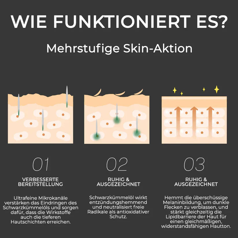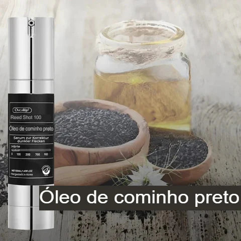 Com   óleo natural de cominho preto  – rico em timoquinona e antioxidantes. Alivia manchas escuras, cicatrizes de acne e hiperpigmentação.