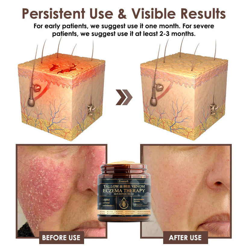 Clinicamente testado por dermatologistas, o creme de restauração da pele com veneno de abelha Zvoevo® pode mostrar melhorias significativas em eczema e dermatite em 7 dias.